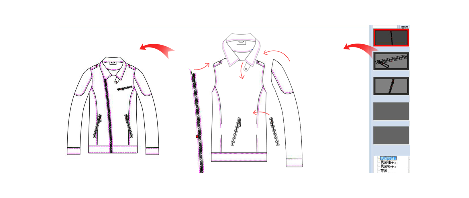 建立设计部位分类数据,调用分类库单元数据,实现数据组合的快速款式开发。无论图形大小,拼接图形自动按比例匹配。